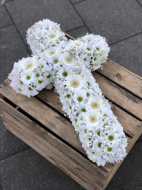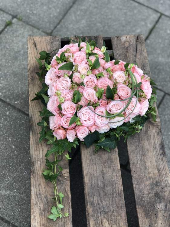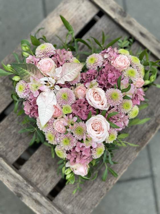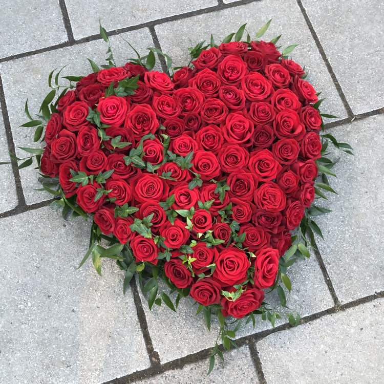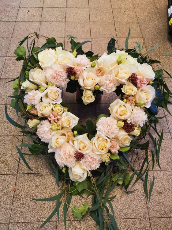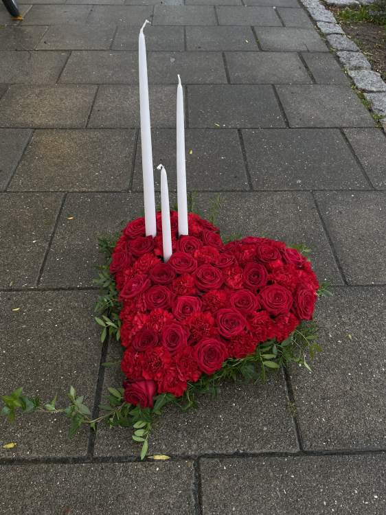 Oasishjärta med rosa kvistrosor, alstroemeria och murgröna. Oasishjärta med blandade blommor i rosa toner. Rött hjärta av rosor och nejlikor med långa ljus. Ett stort hjärta med röda rosor och murgröna. Öppet hjärta med creme, aprikos och vinröda toner, blandat grönt. Kors med germini, krysantemum och brudslöja.